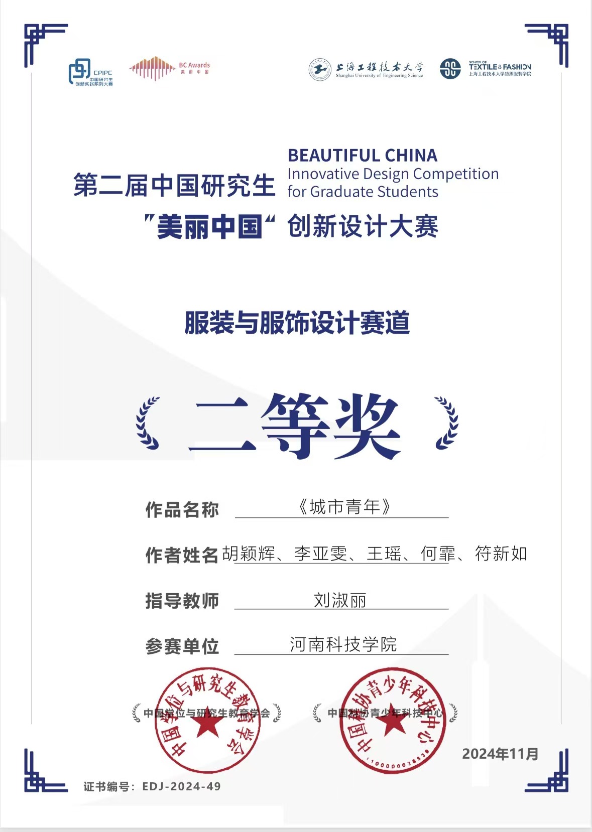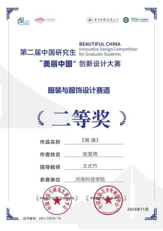 近日,第二届中国研究生“美丽中国”创新设计大赛在上海举行,由我校服装学院王式竹、刘淑丽老师指导,研究生张雯琦的《溯·源》、胡颖辉等同学的《城市青年》在大赛中分别荣获二等奖,为我校赢得了荣誉。