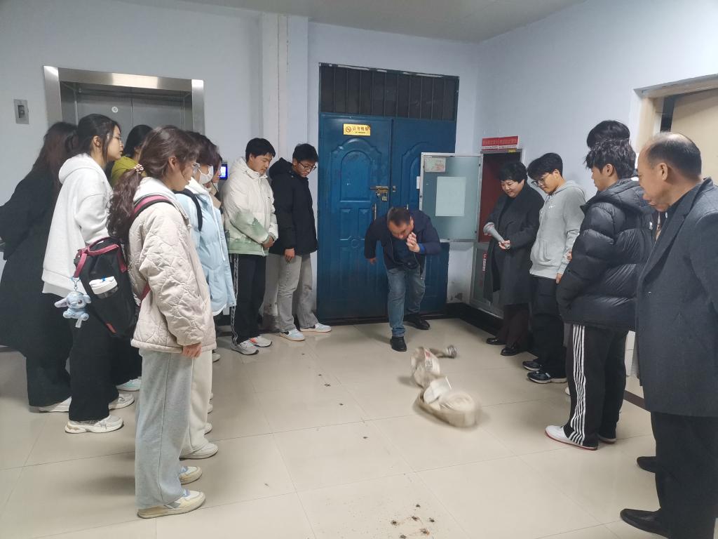 接着,大家来到了消防器材实操演练场地。保卫处消防员为学生代表们现场演示了灭火器、消火栓等常用消防器材的正确使用方法,并详细讲解了在火灾发生时的应急处理流程和逃生技巧。在消防员的指导下,学生代表们纷纷上手,亲自体验了使用灭火器灭火的过程,切实掌握了消防器材的操作技能。