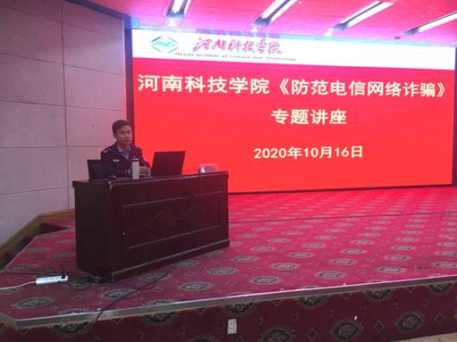 10月16日—21日我校分别在图教201报告厅及2020级新生军训训练现场举办六场次《防范电信网络诈骗》专题讲座。邀请新乡市公安局犯罪侦查支队反电诈中心反诈专家张阳警官为新生讲授防范电信诈骗安全知识。2020级新生及各个班级代理班主任3600余人聆听了讲座.