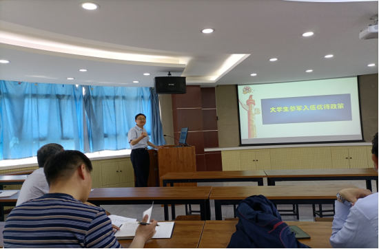 会上,党委武装部副部长宫海军向大家宣传解读了大学生征兵优抚优惠政策,分析了学校征兵工作面临的形势,明确了各学院的征兵任务,还作了题为“以扎实的征兵工作成效,带动我校大学生高质量就业”动员讲话,他从“把握政策、认清形势,提高做好征兵宣传工作的主动性”和“扛牢责任、突出重点,增强做好征兵宣传工作的实效性”两个方面与大家分享了自己的看法,并希望大家要把征兵宣传工作放在心上、抓在手上、落实在行动上,抢抓机遇、有序推进,用扎实的征兵工作成效带动学生稳就业、高质量就业,以优异成绩向党的二十大献礼。