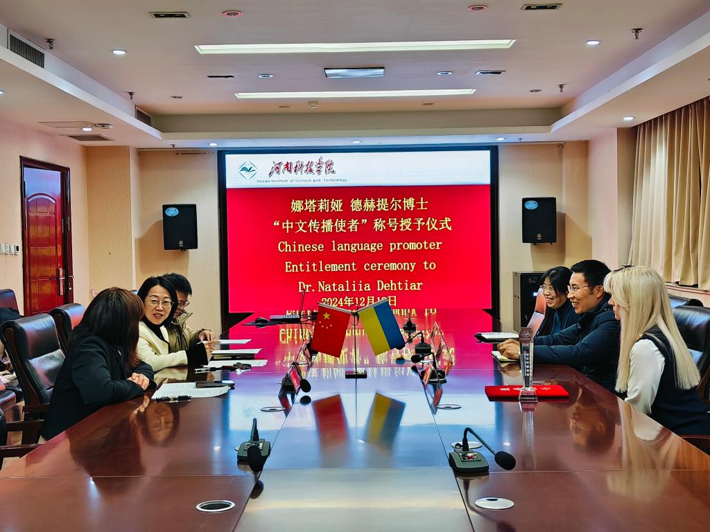 12月19日下午,我校授予苏梅国际学院乌克兰籍教师娜塔莉娅·德赫提尔博士(Nataliia Dehtiar) “河南科技学院中文传播使者”的仪式在办公楼901会议室举行。国际交流与合作处、文法学院、苏梅国际学院、留学教育中心有关人员参加了本次仪式。国际交流与合作处处长冯霞代表学校向娜塔莉娅·德赫提尔博士颁发了“河南科技学院中文传播使者”荣誉证书及奖杯。