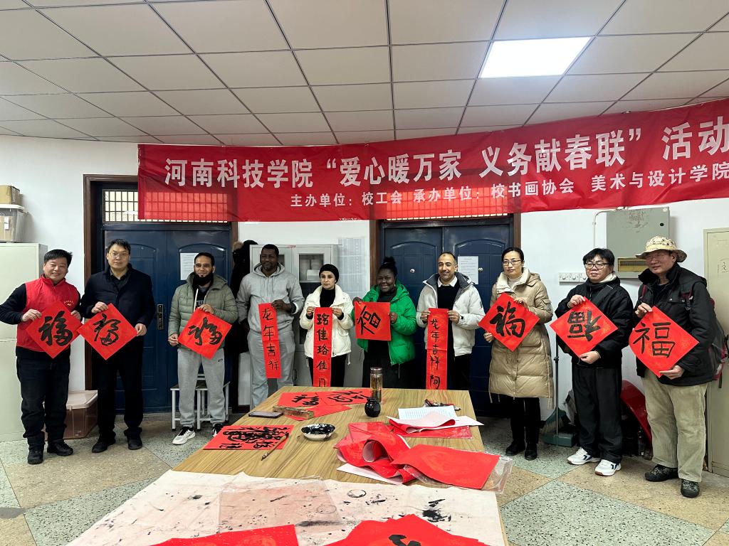 1月19日,国际交流与合作处教师和外籍教师一同参与河南科技学院校工会主办的“爱心暖万家、义务献春联”活动。活动现场,来自新加坡、巴基斯坦等8名外籍教师与我校书法家们一起,感受中国文化,迎接新春佳节。