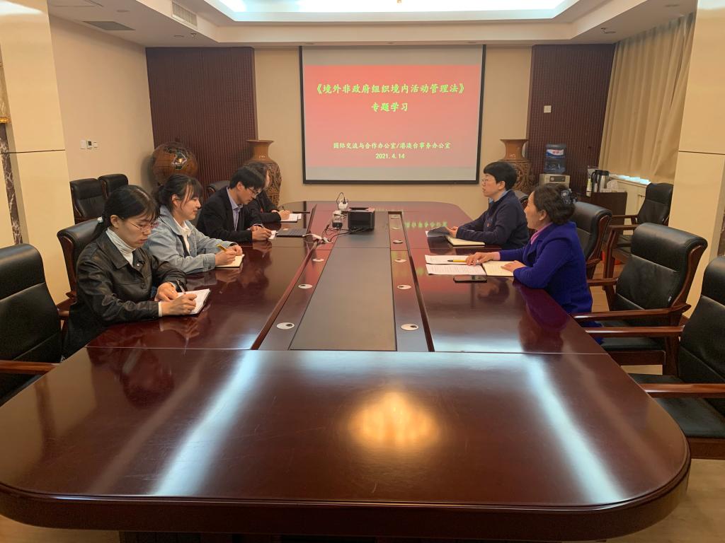 4月14日,国际交流与合作办公室/港澳台事务办公室在行政楼1111会议室举办《中华人民共和国境外非政府组织境内活动管理法》专题学习活动,部门全体人员参加学习活动。