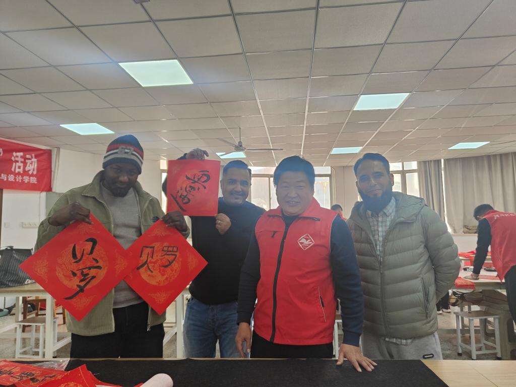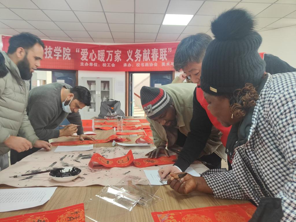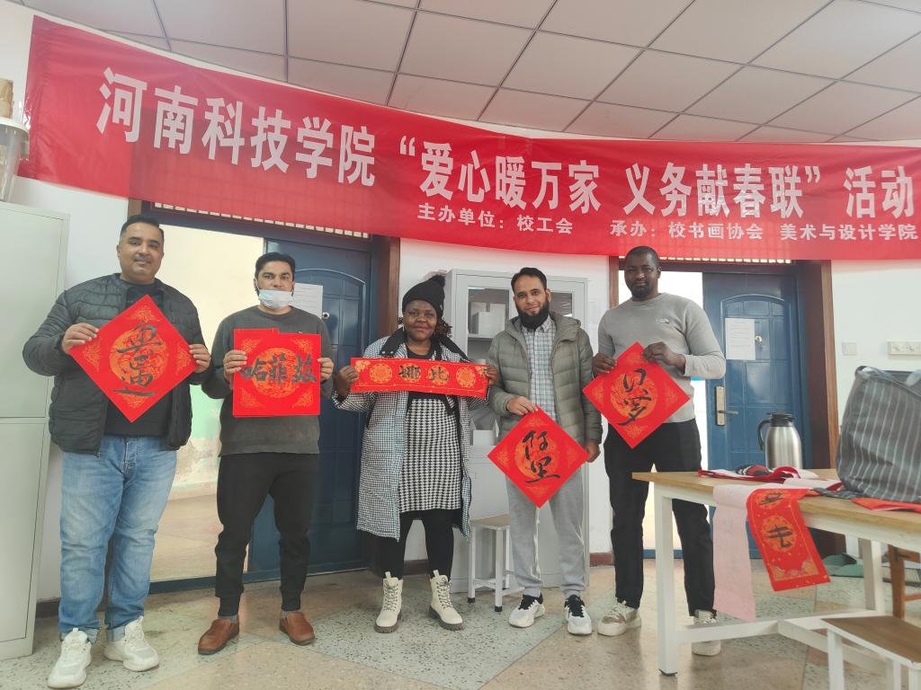 1月13日,国际交流与合作处教师和外籍教师一同参与河南科技学院校工会主办的“爱心暖万家、义务献春联”活动。活动现场,来自巴基斯坦、喀麦隆等5名外籍教师与我校书法家们一起感受中国文化,迎接新春佳节。
