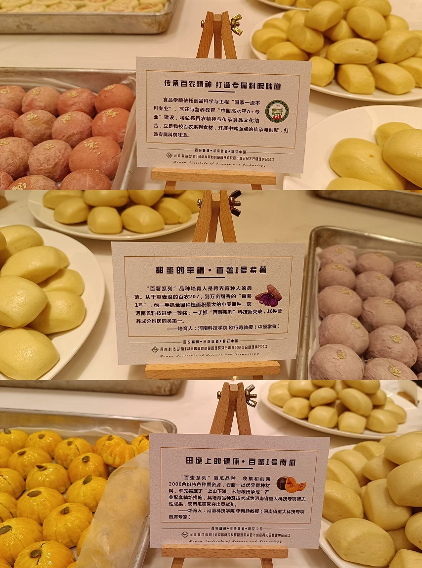 会议期间,食品学院师生团队将科研成果转化为文化载体,展示了以我校农学院茹振钢教授培育的小麦面粉、欧行奇教授培育的紫薯,李新峥教授培育的南瓜为主要食材制作的“馒头”“黛玉酥”,“南瓜酥”等中式面点。植物保护与环境学院展示了张中印教授研发的百蜂"系列产品为原料制成的饮品,园艺园林学院展示了刘会超教授与非遗传承人刘砚璞联合制作的百堇非遗花糖。与会来宾评价这些科研成果既彰显了河南农业大省的担当,又创新诠释了"非遗活化"的现代路径。