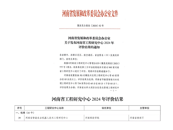 近日,河南省发展和改革委员会委托第三方评估机构组织专家对995家省级工程研究中心进行评价并公布评价结果,共有43家省工程研究中心获评优秀,827家获评合格或基本合格。我校11家省级工程研究中心全部获得基本合格以上评价,其中河南省智能农业机器人技术工程研究中心评价结果为优秀,这是该中心继2022年首次获评优秀后再获优秀殊荣。