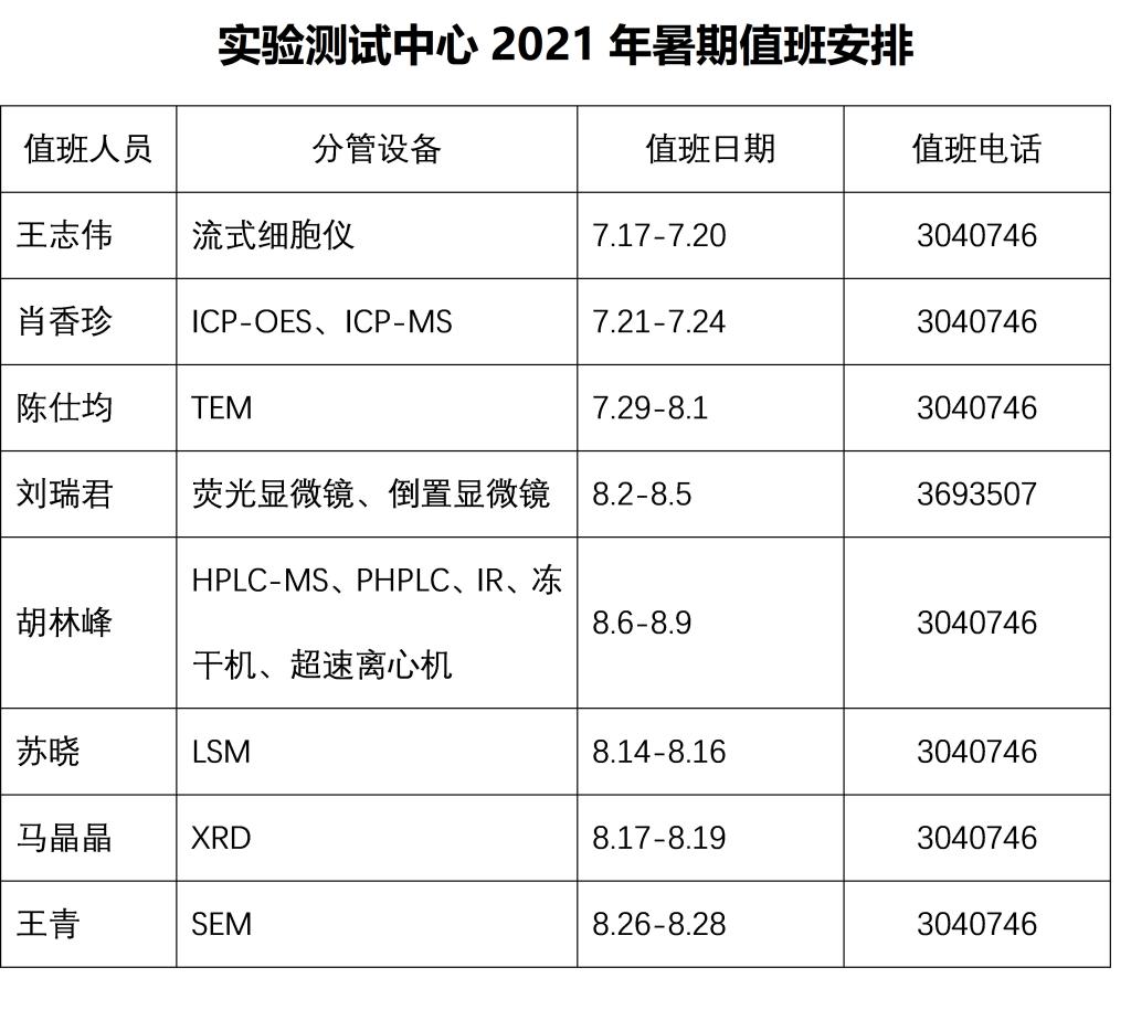 根据学校2021年暑期放假安排,实验测试中心2021年暑期轮休值班安排如下: