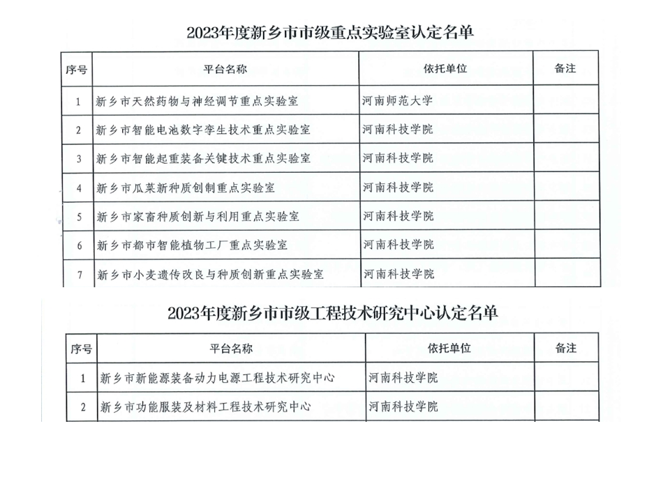 近日,新乡市科学技术局公布了《关于认定2023年度新乡市市级研发平台的通知》(新科【2023】54号),我校获批建设8个市级平台,其中包括6个新乡市市级重点实验室和2个新乡市市级工程技术研究中心。