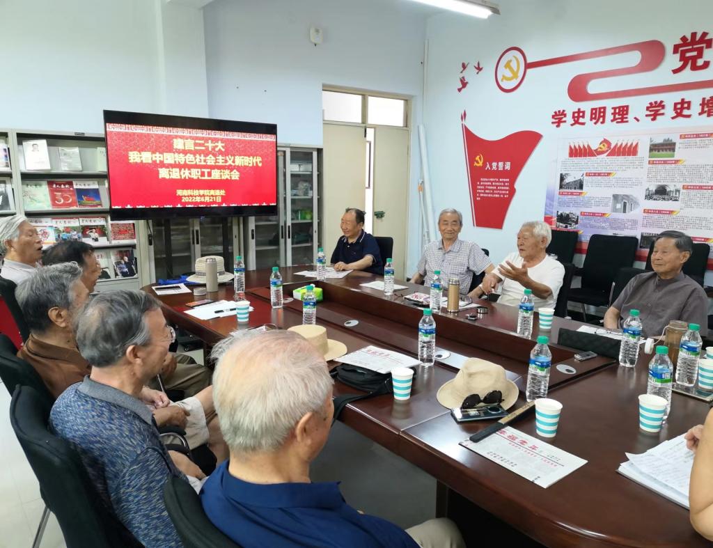 为贯彻落实中共河南省委老干部局《关于在全省离退休干部中开展“建言二十大”和“我看中国特色社会主义新时代”调研活动的通知》精神,6月21日上午,离退休职工管理处在党建活动室组织召开“建言二十大”和“我看中国特色社会主义新时代”专题调研座谈会,王清连、杨永光、金德瑞、杨怀森、邓学法、韩德全、魏永超、任长见、吴国梁、王运兵等10名退休老干部、老专家、离退休职工管理处班子成员及工作人员参加座谈会。会议由马根喜主持。