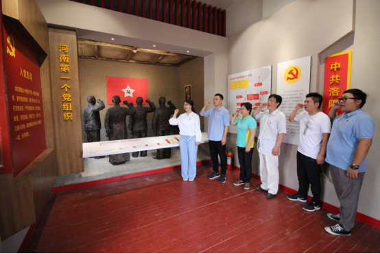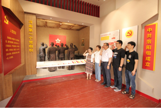 在纪念馆里,大家聆听和学习了老一辈革命家积极投身革命的光辉事迹,重温了那一段波澜壮阔的革命历史。1920年底,北京大学马克思主义研究会的进步青年游天洋受命来到洛阳,进入洛阳铁路修理厂,之后与白眉珊等先进分子一起,成立了洛阳陇海铁路工人俱乐部,并借助在《工人周刊》上撰文及工人子弟学校讲课等形式,向铁路工人宣传革命思想。1921年12月,由李大钊、罗章龙介绍,经中共北京区委批准,游天洋等三名同志加入中国共产党,并成立“中共洛阳组”,游天洋任组长。“中共洛阳组”是中国共产党成立后,在河南乃至中原地区成立的第一个党组织,揭开了中国共产党在河南建党活动的序幕,河南因而成为全国建党较早的省份之一。此后,党组织在中原大地如雨后春笋般迅速发展,河南的革命运动进入了一个新的阶段。郑州、开封、商丘等地也纷纷掀起发展党组织、成立工会的运动。 这是一个初心起航的地方,也见证了我们的党组织由小到大的历史进程。