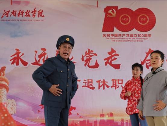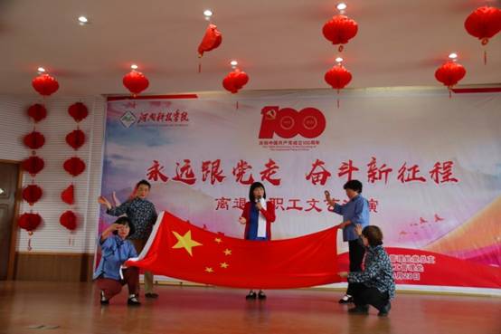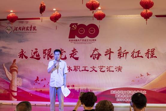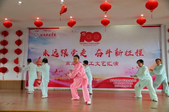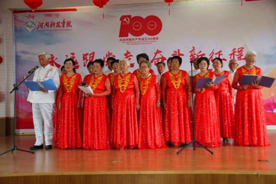 伴随着《唱支山歌给党听》的歌声,文艺汇演拉开帷幕。舞蹈《旗帜》、《红梅赞》,柔力球《祖国你好》,豫剧《绣红旗》、《红灯记》、《祖国的大建设》等形式多样、内容丰富的表演充分表达了共产党好、社会主义好、改革开放好、伟大祖国好、各族人民好的时代主旋律。由平均年龄近75岁的离退休合唱团带来了红歌联唱,《长征》、《红船向未来》、《延安颂》回顾了中国共产党的百年光辉历程,刻画了一幅幅让人心潮澎湃的历史画卷,再现了波澜壮阔、气壮山河的党的史诗。