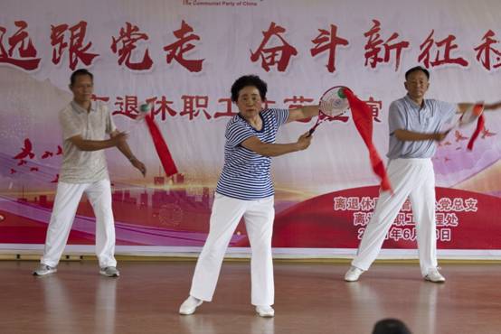 为庆祝中国共产党成立100周年,6月28日下午,离退休职工管理处党总支、离退休职工管理处在教职工活动中心四楼举办“永远跟党走 奋斗新征程”离退休职工文艺汇演。离退休职工管理处党总支书记马新岭致辞,离退休合唱团、舞蹈队、太极拳协会、戏曲协会、柔力球队全体成员参加了本次文艺汇演。