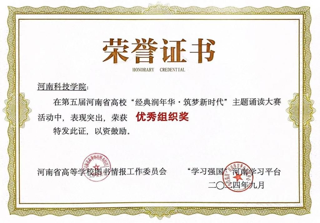 近日,由河南省高等学校图书情报工作委员会、“学习强国”河南学习平台主办的第五届河南省高校“经典润年华·筑梦新时代”主题诵读大赛获奖名单揭晓,我校再获佳绩。