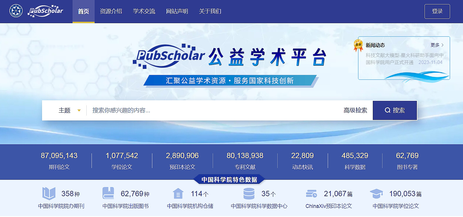 近日,由中国科学院文献情报中心、中国科学院计算机网络信息中心、科学出版社等单位联合建设的PubScholar公益学术平台正式对社会公众开放。