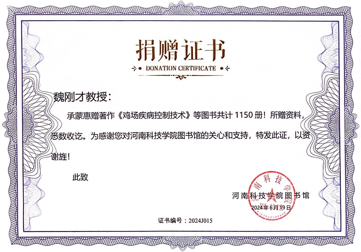 捐以书籍,寄寓希望。魏刚才教授此次捐赠的资料主要包括其主编的《鸡场疾病控制技术》等图书、早期教学的手写教案等170余种1000余册,种类繁多、内容丰富,彰显了离退休教师情系科院、身退心犹在的师道精神。