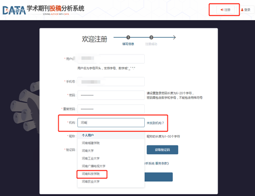 方式一:访问网址http://datauthor.com/注册登录;在注册时机构处搜索并选择“河南科技学院”(也可在个人中心-申请认证),并填写真实姓名和学号或工号,后台审核通过后需退出后重新登录。认证后将获得机构使用权限。