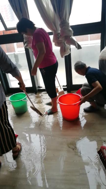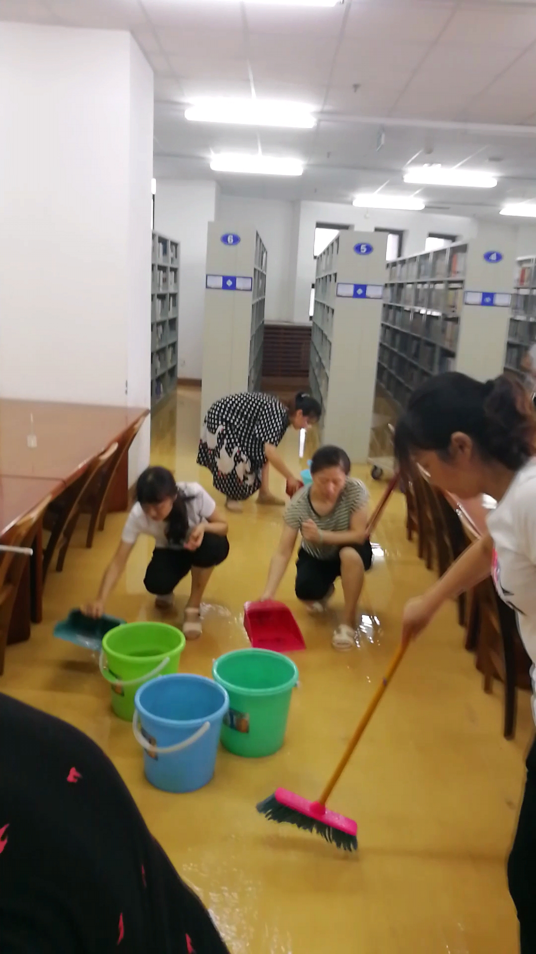 随后,在排查中发现五楼书库部分区域和“双湖知苑”有积水倒灌现象,在馆领导的带领下,同志们忘记疲惫,积极投入到积水清扫工作中,保证了馆藏资源的安全。