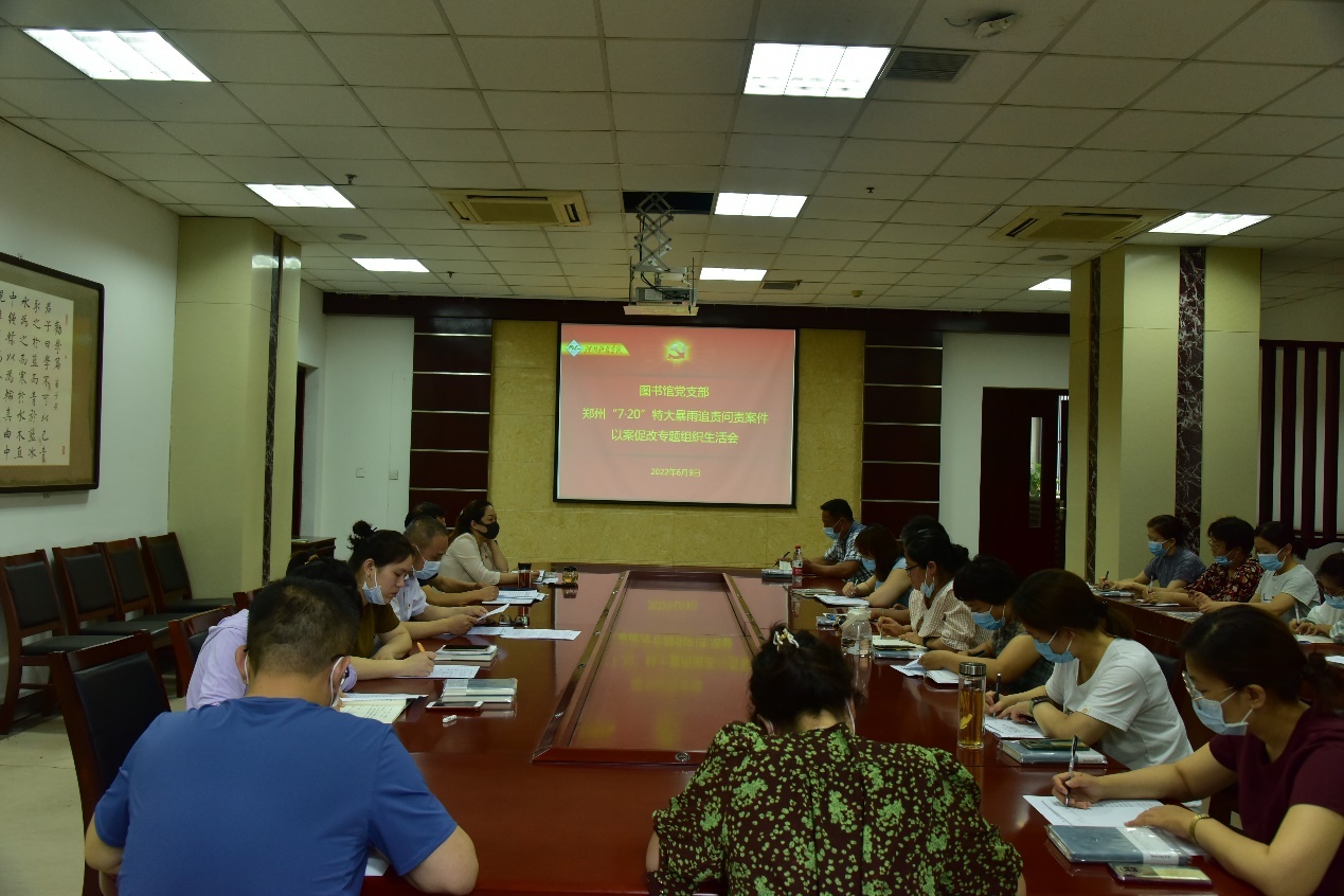 6月9日下午,图书馆党支部在图书馆小会议室召开郑州“7·20”特大暴雨灾害追责问责案件以案促改专题组织生活会,会议由图书馆党支部书记赵坤主持,全体党员参加会议。