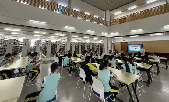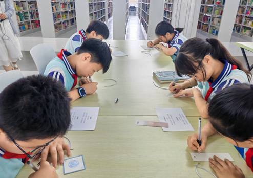 在图书馆工作人员的讲解和引领下,同学们深入了解了图书馆的基本概况、馆藏资源分布以及图书借阅的具体流程,参观了书库、阅览区、休闲区等不同功能空间,并亲身体验了自动借还书机、图书检索机等现代化数字设备的操作使用。同时,为增强互动体验,工作人员还特别设计了“趣味寻书”“诗词抄写”等小活动,让同学们在轻松愉快的氛围中加深对图书馆的认识。