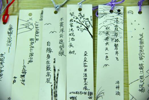 在“诗词抄写”活动中,图书馆工作人员精选了多首适合六年级学生学习与鉴赏的诗词,让学生们在抄写中感受传统文化魅力。学生们在“落霞与孤鹜齐飞,秋水共长天一色”中感受着诗情画意,在书签上描绘出了自己对于诗词的理解和感悟。