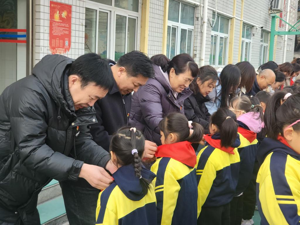 在庄严的队歌声中,党员教师亲手为新队员佩戴红领巾,传递红色基因和爱党爱国的崇高信念。鲜艳的红领巾承载着党的嘱托,也激励着新一代少年儿童在党的引领下茁壮成长。党支部书记郭斐杰激励少先队员们热爱祖国、奋发图强、刻苦学习、争做新时代好队员,在星星火炬的照耀下,感党恩、听党话、跟党走,全面发展,成为德智体美劳全面发展的社会主义建设者和接班人。