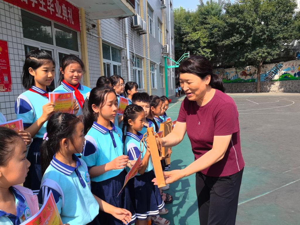 郭斐杰为毕业生代表颁发毕业证书并送上祝福,她希望同学们壮志在胸,理想在怀,永葆热爱,进步不止。郭斐杰对本学期各项工作进行了总结回顾,并强调在假期期间一定注意自身安全,希望同学们做到与书为伴,增长见识、锻炼身体、强健体魄。