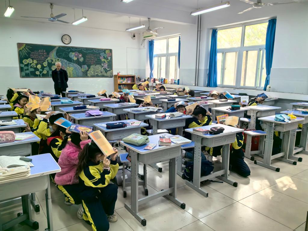 上午,第一次警报拉响,防震演练开始。全体老师马上赶到指定地点,做好疏散准备。学生在班主任老师组织下借助课桌、墙、书包等进行“三角区”的防震避难训练。整个演习过程,教师沉着冷静、指挥若定,同学们临危不惧,演练取得圆满成功。整个演练过程3分20秒。