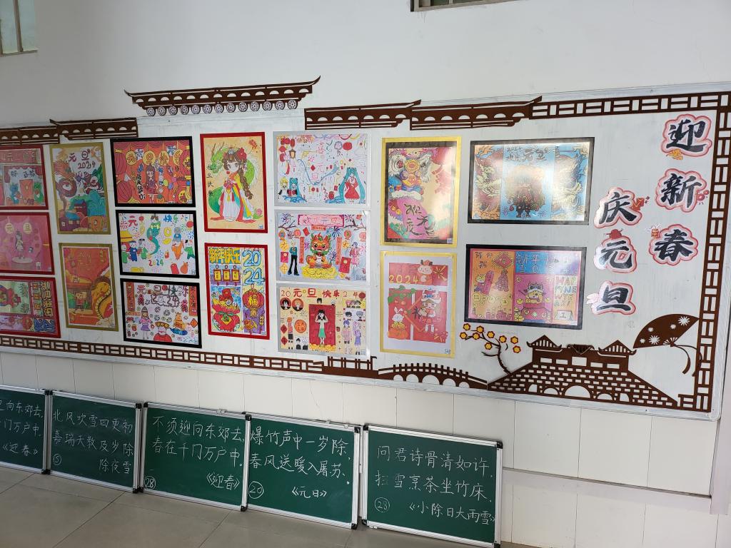 学生用图画勾勒出对新年的美好祝愿,也是对未来的期盼与憧憬。孩子们的书法作品令人赏心悦目,一笔一画,书写汉字之美,一撇一捺,弘扬传统文化。最后每班有12幅作品脱颖而出,分别在楼道和班级宣传专栏中展示。一幅幅线条流畅、构思巧妙的书画作品,吸引了众多师生驻足观看。