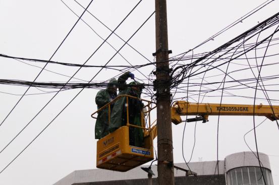为迎接学校本科教学审核评估,加强校园环境建设,消除线路脱落后给行人和车辆带来的安全隐患。近日,我校对校园内空中的电缆线、网线、监控线等线路进行规范化治理。