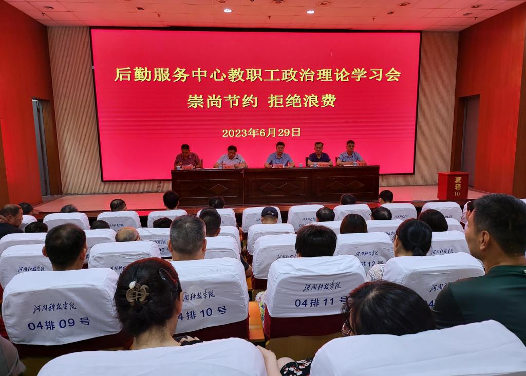 6月29日下午,后勤服务中心在图书馆一楼报告厅召开政治理论学习会议,党政班子成员和全体教职员工参加了会议。会议由后勤服务中心党委书记龚俊朋主持。