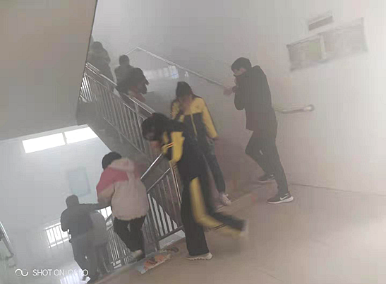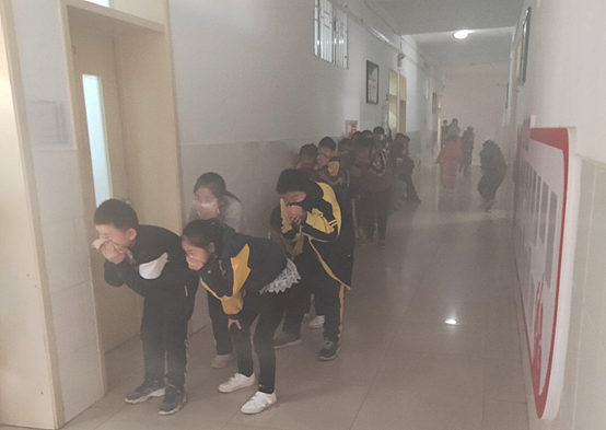 9点35分,警报响起,演练开始。楼道里浓烟滚滚,各位老师立即按照演练方案迅速到达指定位置,引导楼内学生即可疏散。学生捂住口鼻、弯着腰,在教师带领下沿着学校指定的逃生路线快速有序撤离到学校操场。整个过程平稳有序,用时3分零2秒。