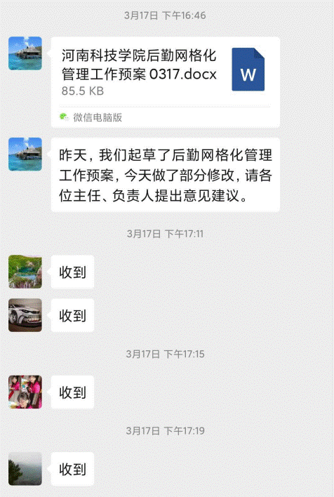 四、制度出台,有制可依。后勤保障组结合工作实际,出台《河南科技学院网格化管理工作预案》。内容包括《疫情防控后勤保障预案》、《疫情防控期间通风、消毒制度》、《疫情防控期间环境卫生检查通报制度》、《设立临时隔离区工作方案及建议》、《学生餐厅新冠肺炎疫情防控工作方案》等。建立定期沟通协调机制,坚持每天一次情况通报会,每周一次工作推进会,做到情况及时掌握,问题及时发现、及时解决。