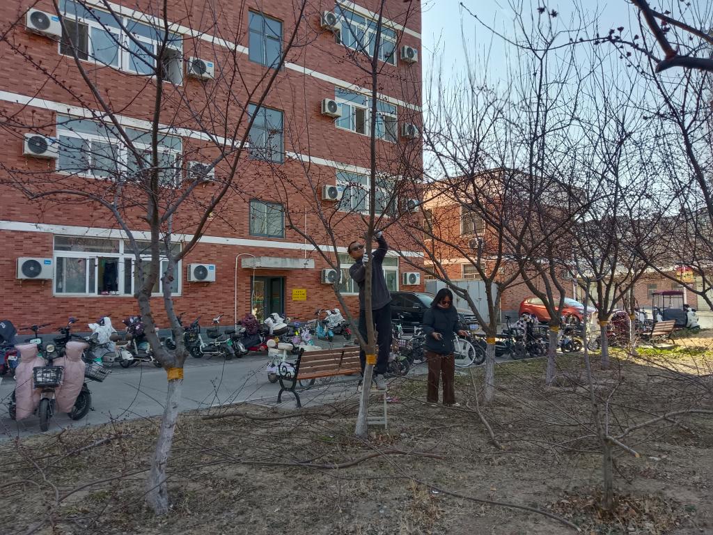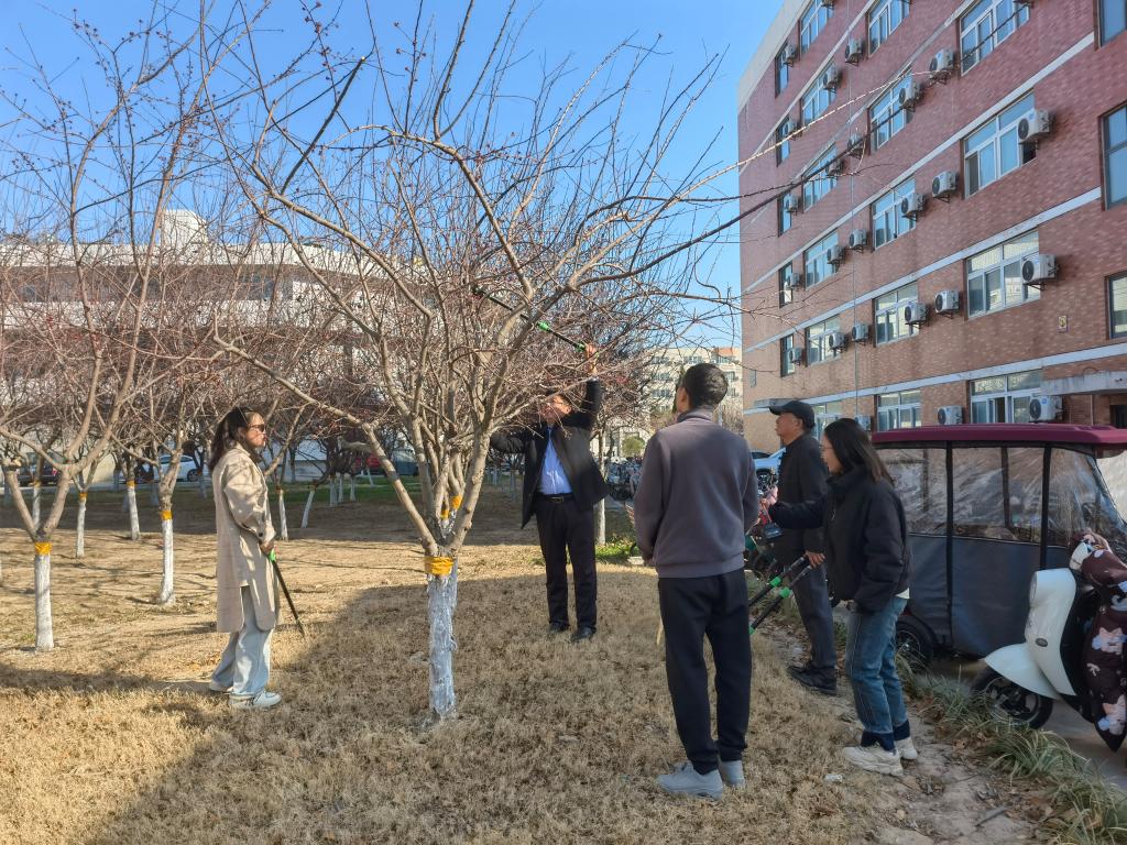 劳动过程中,后勤服务中心副主任张建设开展技术指导,从海棠树的生长特性、修剪原理到操作规范进行系统讲解。大家手持压力剪、手锯、手剪等专业工具,对海棠树的病弱枝、交叉枝进行精细化修剪。经过两小时劳作,海棠树焕发生机。