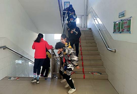 上午9:35分演练准时开始,在急促的警报声中,各楼层、走廊负责的老师以最快的速度到达所在的岗位,六年级学生在班主任有序的组织下,按本班的疏散路线有序撤离到操场上。整个过程不到1分钟。