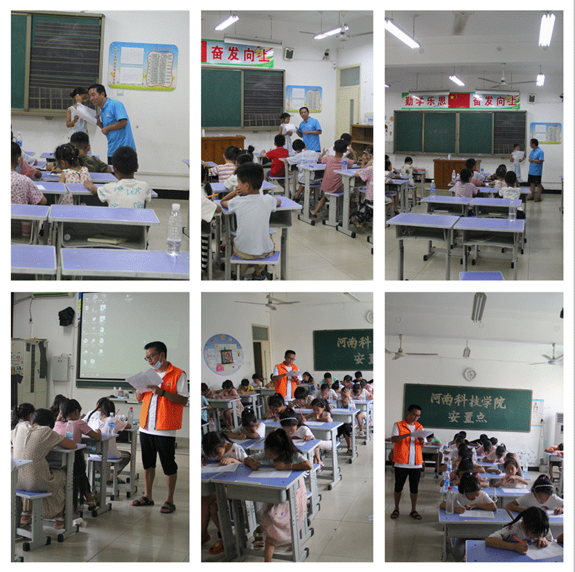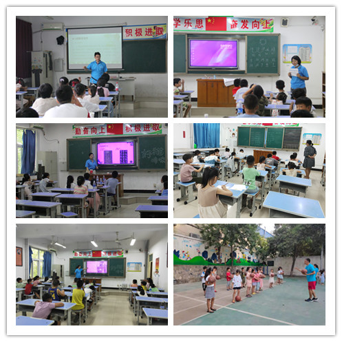 本天上午,子弟学校老师赵艳、王莹、姚艳芬等9位老师组织卫辉的孩子们进行了“跳绳、踢毽子”、“趣味数学”、“音乐”、“书法”、“趣味音标”、“趣味英语”、“中国近代史”等课程的学习;邀请体育学院教师吴亮、胡海坡、王修方带着孩子们进行了篮球训练。