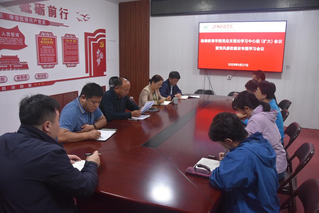 9月27日下午,继续教育学院党总支在二楼会议室召开理论学习中心组(扩大)暨党风廉政建设专题会议,学院班子成员、全体科级干部参加会议。会议由学院党总支书记郭东升主持。
