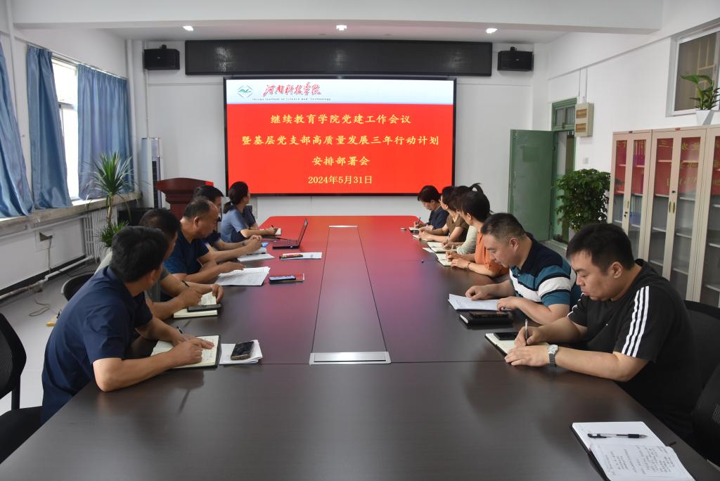 5月31日上午,继续教育学院在实验楼D段202会议室召开党建工作会议暨基层党支部高质量发展三年行动计划安排部署会议,班子成员、全体党员参加会议。会议由学院党总支书记郭东升主持。