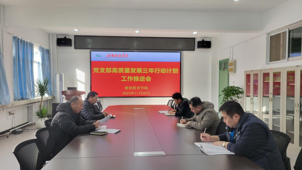 11月26日下午,继续教育学院在实验楼D202会议室召开党支部高质量发展三年行动计划工作推进会议,学院党总支委员、支部书记参加会议,会议由党总支书记郭东升主持。
