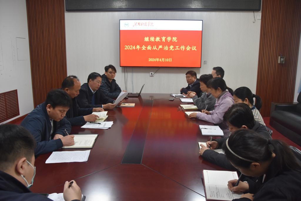 4月10日上午,继续教育学院在二楼会议室召开2024年全面从严治党工作会议,学院党政班子成员和全体教职员工参加了会议。会议由学院党总支书记郭东升主持。