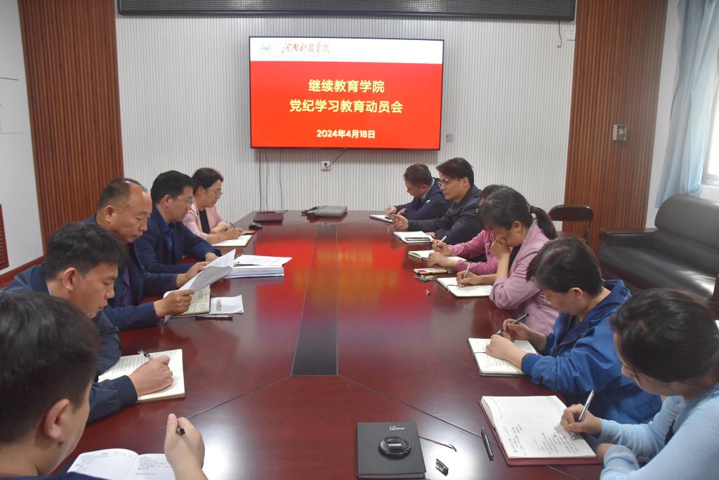 4月18日下午,继续教育学院在学院二楼会议室召开党纪学习教育动员会,学院领导班子成员、全体党员参加会议。会议由学院党总支书记郭东升主持。