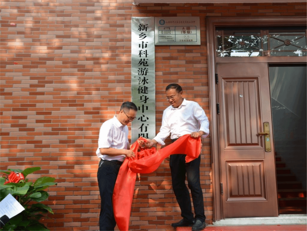 揭牌仪式由资产公司副总经理、新乡市科苑游泳健身中心有限公司经理刘鹏主持,教务处处长杨宾峰、保卫处处长刘克平、后勤服务中心主任王吉田、体育学院党委书记徐现峰等应邀出席仪式,体育教育系主任、国家级游泳考评员尚保春教授,河南百农种业有限公司总经理张德福等嘉宾参加仪式。