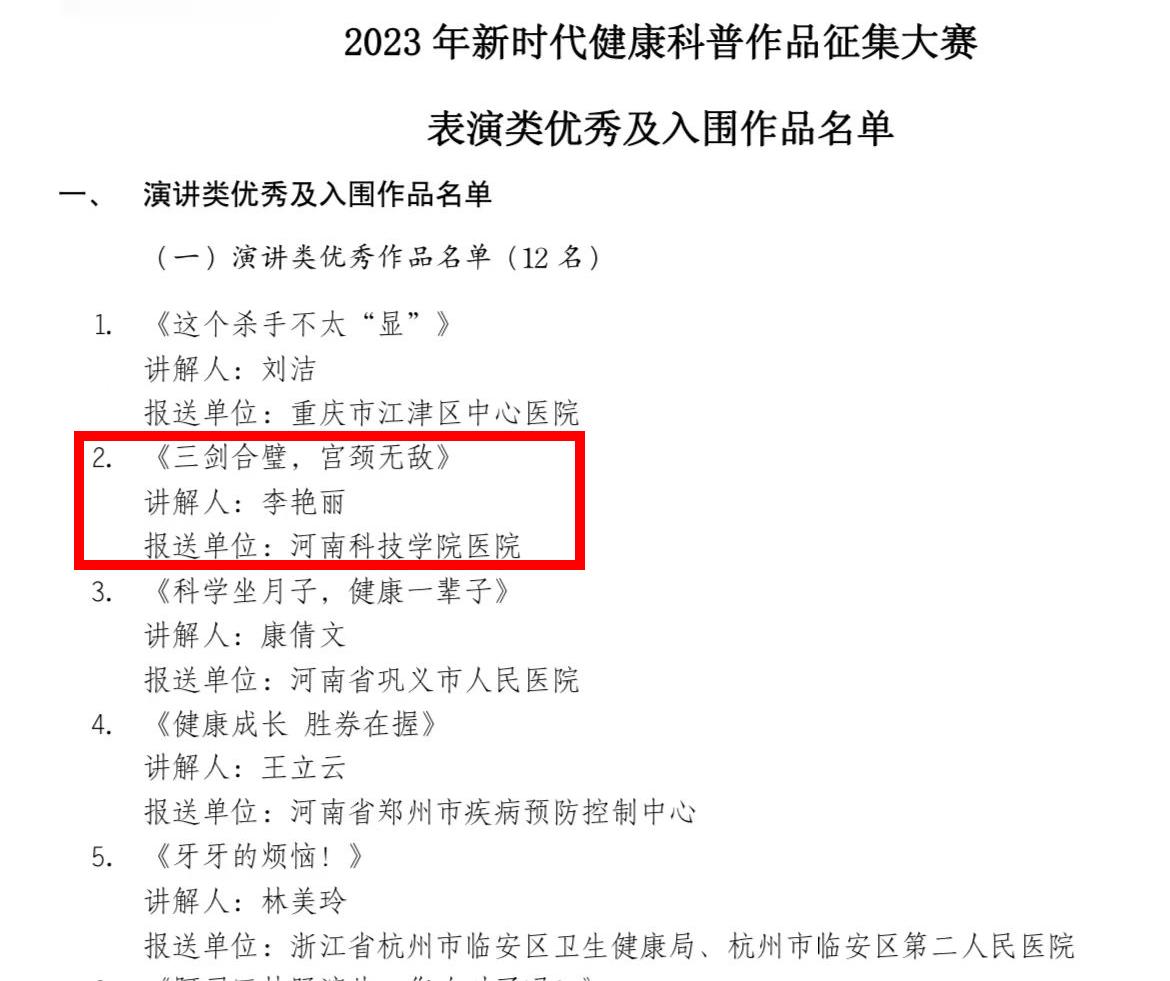近日,国家卫生健康委宣传司发布了2023年新时代健康科普作品征集大赛优秀及入围作品名单通知,我校校医院院长李艳丽的科普作品《三剑合璧,宫颈无敌》入选。“健康知识普及行动—2023年新时代健康科普作品征集大赛”由国家卫生健康委、科技部、国家中医药局、国家疾控局、中国科协共同组织开展。