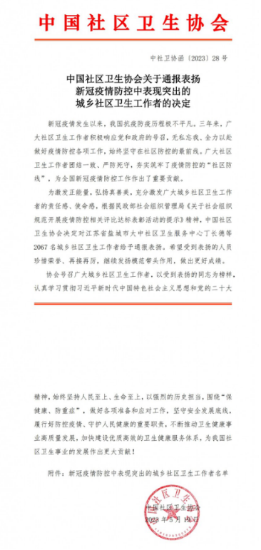 5月19日,中国社区卫生协会发布《中国社区卫生协会关于通报表扬新冠疫情防控中表现突出的城乡社区卫生工作者的决定》(中社卫协函[2023]28号),在全国范围共表扬2067名城乡社区卫生工作者。