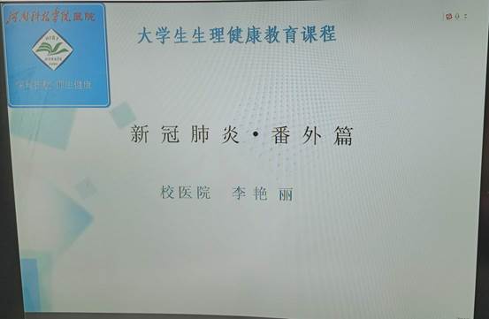 新冠肺炎疫情防控进入新阶段,为了巩固疫情防控稳定局面,国家卫健委及教育部发出了关于高校延迟开学的通知,很多老师和同学盼归心切,为了缓解师生的焦虑情绪,校医院副院长李艳丽为我校广大师生录制“新冠肺炎防疫知识”宣讲视频,通过河南科技学院新媒体工作室公众号向全校师生进行播放,得到广大师生的一致好评;还在在我校大学生健康教育网络课程中增加《新冠肺炎*番外篇》,该课程被广为转发,同学们纷纷反映:疫情期间听到自己校医院医生的讲解,对新冠肺炎有了更清晰准确的认识,心里不再恐慌了。