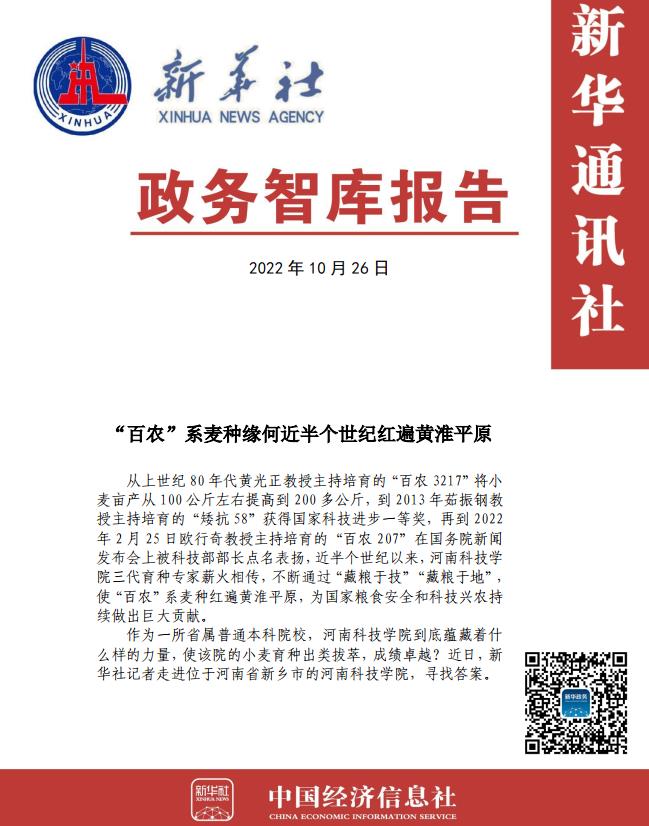 近日,新华社政务智库报告以《“百农”系麦种缘何近半个世纪红遍黄淮平原》为题,对我校育种专家薪火相传,通过“藏粮于技”“藏粮于地”,使“百农”系麦种红遍黄淮平原,为国家粮食安全和科技兴农持续做出巨大贡献的事迹进行了深度报道。报告全文如下: