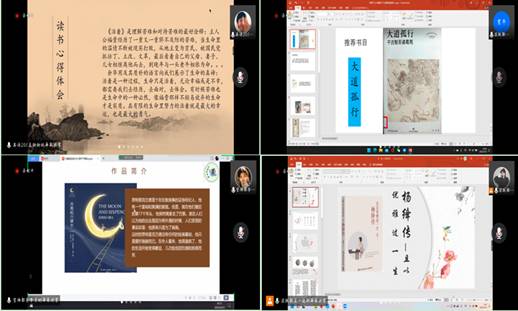 化学化工学院的王甜甜同学通过PPT分享了余华的《活着》,通过浓缩的苦难,来表达活着的意志和生命的顽强,从而让读者学会释怀过往、珍惜当下。机电学院谢高奎同学分享的《四世同堂》,启示我们应该牢记历史、莫忘国耻、掌握知识、科技兴国,为祖国的繁荣昌盛贡献自己的力量。文法学院王一迪同学通过唯美的画面,让我们了解了“腹有诗书气自华”的杨绛先生的百年睿智人生。其他同学还推荐了《北京折叠》《大道孤行:千古智胜诸葛亮》《鼠疫》《月亮与六便士》《舟山有意思》等书籍,朗读了自己最欣赏的章节句子,分享了自己的阅读感悟。