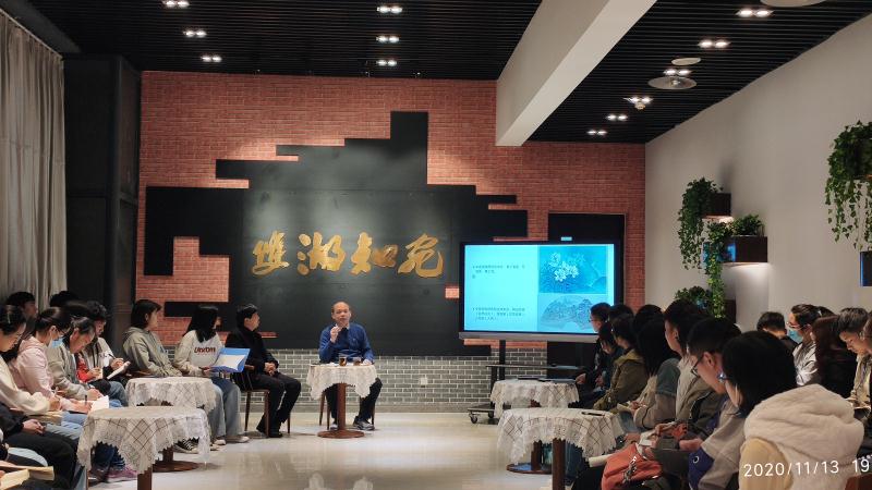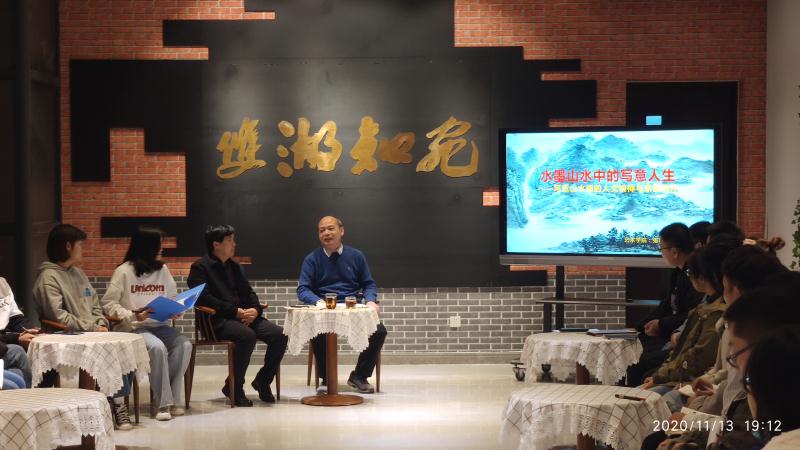 11月13日晚,由图书馆主办的第十期双湖知苑在图书馆五楼举行。本次活动以《水墨山水中的写意人生——写意山水画的人文精神与家国情怀》为主题,特邀艺术学院院长张新词做主讲嘉宾,图书馆副馆长孙用明出席此次活动,黄河浪文学社的部分成员及各学院的50余名书画爱好者参加了活动。