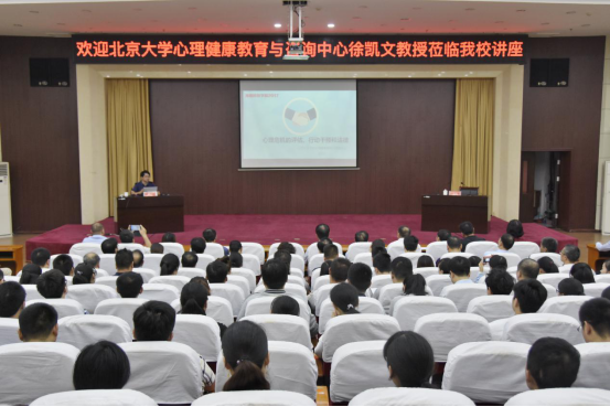 为促进我校心理健康教育的进一步发展、加强我校思想政治教育工作队伍建设,我校特别邀请北京大学心理健康教育与咨询中心副主任、总督导徐凯文教授于9月5日下午3:30在我校行政楼三楼报告厅做“大学生心理危机干预与案例督导”专题讲座,刘莉莉副校长主持报告会,宣传部、学生处、保卫处等部门全体人员及各学院党委书记、副书记、全体辅导员、心理中心专兼职咨询老师约200余人参加了讲座。