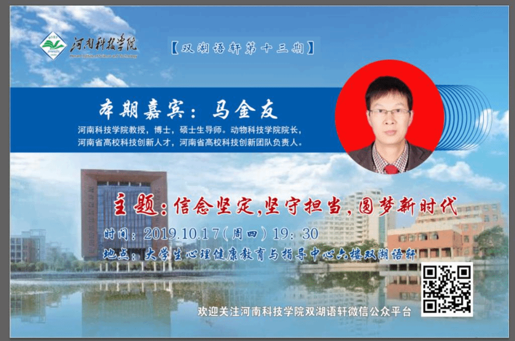 10月17日晚7:30,我校第十三期“双湖语轩”在大学生心理健康教育与指导中心举行。本期“双湖语轩”以“信念坚定、坚守担当、圆梦新时代”为主题,邀请河南省教育厅学术技术带头人,河南省高校科技创新人才,河南省高校科技创新团队负责人,河南科技学院第六届学术委员会委员,河南科技学院病毒研究所所长,河南科技学院动物科技学院院长马金友教授任对话嘉宾,来自各学院的26名学生代表参加了本次活动。