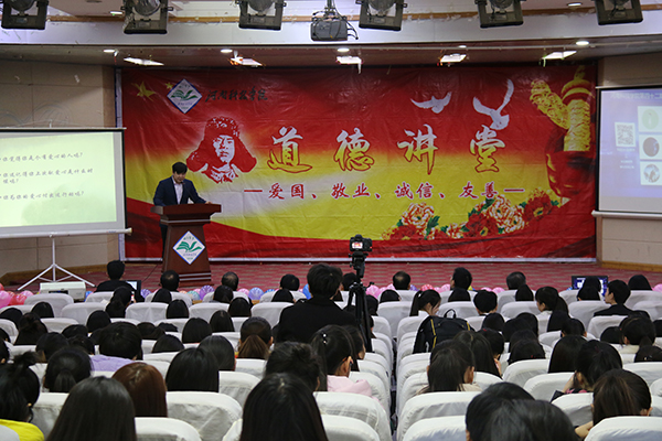 12月22日下午,由校文明办主办、外国语学院承办的第四十三期道德讲堂在图教201举行。校团委、武装部、学生处、后勤管理处等单位相关负责人,外国语学院党政领导和师生代表300余人参加了活动。